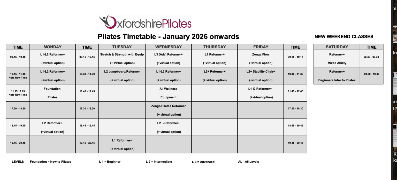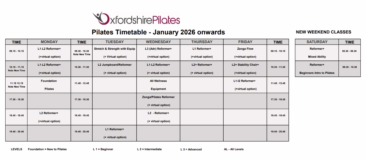| 10.30 – 11.30 | L1-L2 Reformer+ (+ virtual option) | L2 Jumpboard/Reformer (+ virtual option) | L1 – L2 Reformer+ (+ virtual option) | L2+ Reformer+ (+ virtual option) | L2+ Stability Chair+ (+ virtual option) | 10.30 – 11.30 |